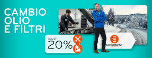 * L’offerta è valida fino al 28 febbraio 2026 presso tutte le Officine aderenti all’iniziativa e prevede lo sconto sul listino del 20% su: cambio olio motore, filtri olio, aria e abitacolo, per le vetture con anzianità superiore ai 36 mesi. Ricambi Eurorepar, previa disponibilità prodotto per il modello vettura in possesso. Il costo della manodopera è escluso dalla promozione. Offerta non cumulabile con altre iniziative in corso. L’offerta non sostituisce il tagliando di manutenzione programmata prevista dal libretto uso e manutenzione. Le immagini sono puramente a scopo illustrativo.